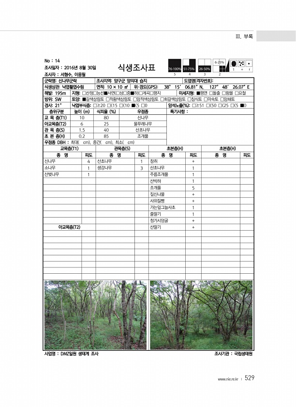 Ⅲ. 부록 www.nie.re.kr ? 529 No 14 조사일자 2016년 8월 30일 조사자 서형수, 이응필 식생조사표 군락명신나무군락 조사지역양구군 양의대 습지 도엽명 격자번호 식생상관낙엽활엽수림 면적10 × 10 ㎡ 위·경도 GPS 38° 15′ 06.81″N, 127° 48′ 26.07″E 해발195m 지형□산정□능선■사면 □상□중■하 □계곡□평지 미세지형■평면 □돌출 □함몰 □요철 방위SW 토양■갈색삼림토 □적황색삼림토 □암적색삼림토 □회갈색삼림토 □침식토 □미숙토 □암쇄토 경사21° 낙엽부식층□≥20 □ 15 □ 10 ■ 5 □0 암석노출 % □≥51 □ 50 □ 25 □ 5 ■0 층위구분 높이 m 식피율 % 우점종 특기사항 교 목 층 T1 10 80 신나무 아교목층 T2 6 25 물푸레나무 관...