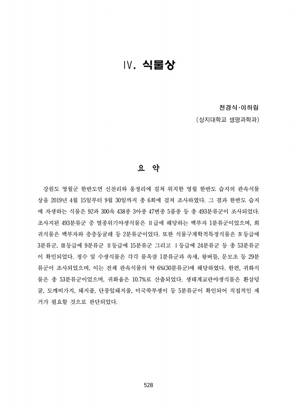 528 Ⅳ. 식물상 천경식·이하림 상지대학교 생명과학과 요 약 강원도 영월군 한반도면 신천리와 옹정리에 걸쳐 위치한 영월 한반도 습지의 관속식물 상을 2019년 4월 15일부터 9월 30일까지 총 6회에 걸쳐 조사하였다. 그 결과 한반도 습지 에 자생하는 식물은 92과 300속 438종 3아종 47변종 5품종 등 총 493분류군이 조사되었다. 조사지된 493분류군 중 멸종위기야생식물은 Ⅱ급에 해당하는 백부자 1분류군이었으며, 희 귀식물은 백부자와 층층둥굴레 등 2분류군이었다. 또한 식물구계학적특정식물은 Ⅳ등급에 3분류군, Ⅲ등급에 9분류군 Ⅱ등급에 15분류군 그리고 Ⅰ등급에 24분류군 등 총 53분류군 이 확인되었다. 정수 및 수생식물은 각각 물옥잠 1분류군과 속새, 왕버들, 문모초 등 29분 류군이 조사되...