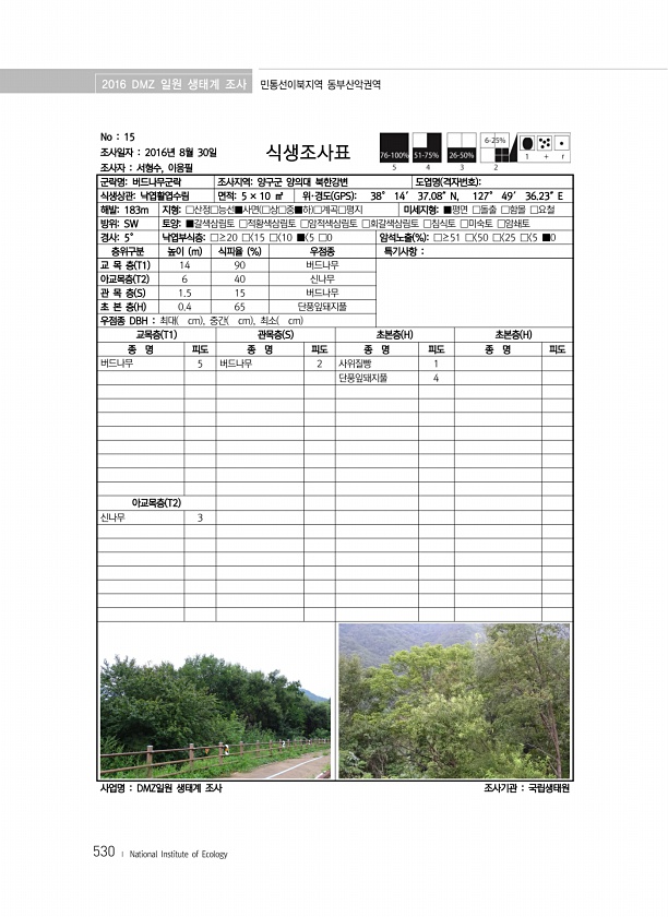 2016 DMZ 일원 생태계 조사 민통선이북지역 동부산악권역 530 ? National Institute of Ecology No 15 조사일자 2016년 8월 30일 조사자 서형수, 이응필 식생조사표 군락명버드나무군락 조사지역양구군 양의대 북한강변 도엽명 격자번호 식생상관낙엽활엽수림 면적5 × 10 ㎡ 위·경도 GPS 38° 14′ 37.08″N, 127° 49′ 36.23″E 해발183m 지형□산정□능선■사면 □상□중■하 □계곡□평지 미세지형■평면 □돌출 □함몰 □요철 방위SW 토양■갈색삼림토 □적황색삼림토 □암적색삼림토 □회갈색삼림토 □침식토 □미숙토 □암쇄토 경사5° 낙엽부식층□≥20 □ 15 □ 10 ■ 5 □0 암석노출 % □≥51 □ 50 □ 25 □ 5 ■0 층위구분 높이 m 식피율 % 우점종...