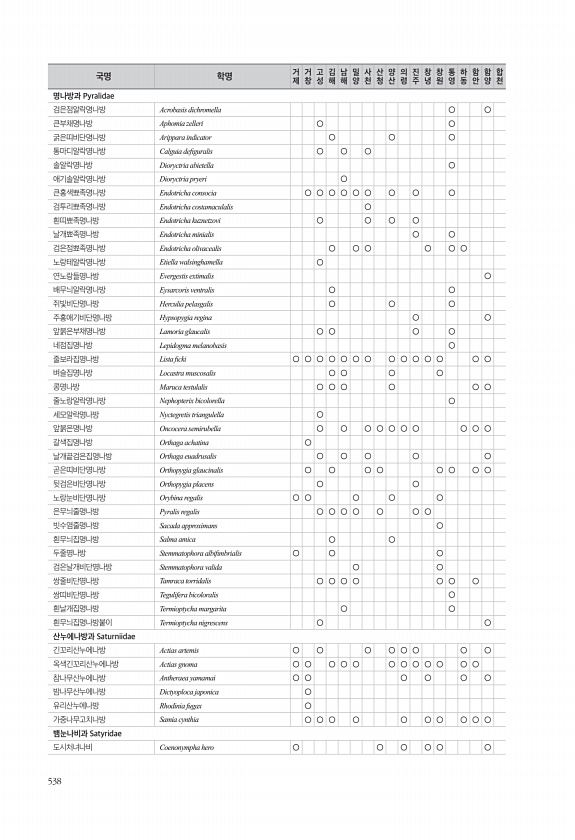538 명나방과 Pyralidae 검은점알락명나방 Acrobasis dichromella ○ ○ 큰부채명나방 Aphomia zelleri ○ ○ 굵은띠비단명나방 Arippara indicator ○ ○ ○ 통마디알락명나방 Calguia defguralis ○ ○ ○ 솔알락명나방 Dioryctria abietella ○ 애기솔알락명나방 Dioryctria pryeri ○ 큰홍색뾰족명나방 Endotricha consocia ○ ○ ○ ○ ○ ○ ○ ○ ○ 검투리뾰족명나방 Endotricha costamaculalis ○ 흰띠뾰족명나방 Endotricha kuznetzovi ○ ○ ○ ○ 날개뾰족명나방 Endotricha minialis ○ ○ 검은점뾰족명나방 Endotricha olivacealis ○ ○ ○ ...