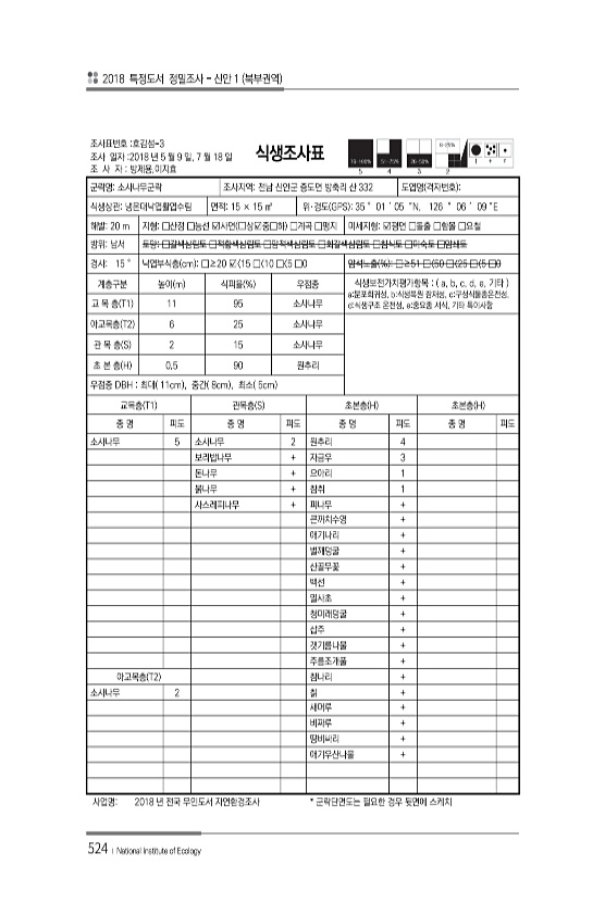 2018 특정도서 정밀조사 신안 1 북부권역 524 ? National Institute of Ecology 조사표번호 호감섬-3 조사 일자 2018 년 5 월 9 일, 7 월 18 일 조 사 자 방제용,이지효 식생조사표 군락명소사나무군락 조사지역전남 신안군 증도면 방축리 산 332 도엽명 격자번호 식생상관냉온대낙엽활엽수림 면적15 × 15 ㎡ 위·경도 GPS 35 ° 01 ′ 05 ″N, 126 ° 06 ′ 09 ″E 해발20 m 지형□산정 □능선 ?사면 ?상?중□하 □계곡 □평지 미세지형?평면 □돌출 □함몰 □요철 방위남서 토양□갈색삼림토 □적황색삼림토 □암적색삼림토 □회갈색삼림토 □침식토 □미숙토 □암쇄토 경사15 ° 낙엽부식층 cm □≥20 ? 15 □ 10 □ 5 □0 암석노출 % □≥51 □〈50...