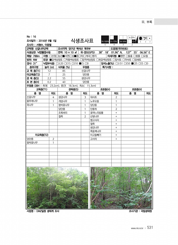 Ⅲ. 부록 www.nie.re.kr ? 531 No 16 조사일자 2016년 9월 1일 조사자 서형수, 이응필 식생조사표 군락명신갈나무군락 조사지역양구군 백석산 계곡부 도엽명 격자번호 식생상관낙엽활엽수림 면적10 × 10 ㎡ 위·경도 GPS 38° 18′ 01.96″N, 127° 55′ 06.56″E 해발788m 지형□산정□능선■사면 □상■중□하 □계곡□평지 미세지형■평면 □돌출 □함몰 □요철 방위NW 토양■갈색삼림토 □적황색삼림토 □암적색삼림토 □회갈색삼림토 □침식토 □미숙토 □암쇄토 경사31° 낙엽부식층□≥20 □ 15 □ 10 ■ 5 □0 암석노출 % □≥51 □ 50 ■ 25 □ 5 □0 층위구분 높이 m 식피율 % 우점종 특기사항 교 목 층 T1 12 85 신갈나무 아교목층 T2 7 25 당단풍 관...