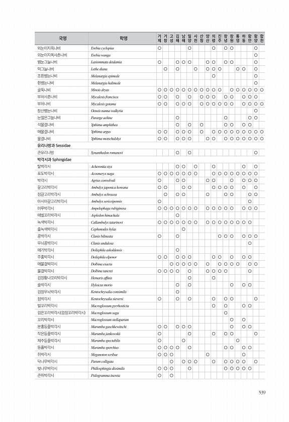 539 외눈이지옥나비 Erebia cyclopius ○ ○ ○ ○ ○ ○ 외눈이지옥사촌나비 Erebia wanga ○ 뱀눈그늘나비 Lasiommata deidamia ○ ○ ○ ○ ○ ○ ○ ○ ○ 먹그늘나비 Lethe diana ○ ○ ○ ○ ○ ○ ○ ○ ○ 조흰뱀눈나비 Melanargia epimede ○ ○ 흰뱀눈나비 Melanargia halimede ○ 굴뚝나비 Minois dryas ○ ○ ○ ○ ○ ○ ○ ○ ○ ○ ○ ○ ○ ○ ○ ○ ○ 부처사촌나비 Mycalesis francisca ○ ○ ○ ○ ○ ○ ○ ○ ○ ○ ○ ○ 부처나비 Mycalesis gotama ○ ○ ○ ○ ○ ○ ○ ○ ○ ○ ○ ○ ○ ○ ○ 참산뱀눈나비 Oeneis nanna walkyria ○ 눈많은그늘나비 P...