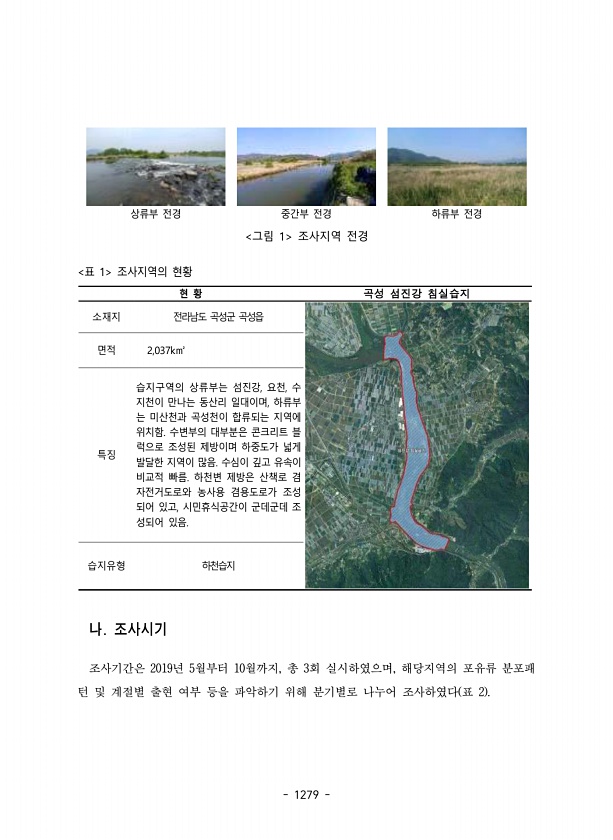 1279 상류부 전경 중간부 전경 하류부 전경 그림 1 조사지역 전경 표 1 조사지역의 현황 현 황 곡성 섬진강 침실습지 소재지 전라남도 곡성군 곡성읍 면적 2,037k㎡ 특징 습지구역의 상류부는 섬진강, 요천, 수 지천이 만나는 동산리 일대이며, 하류부 는 미산천과 곡성천이 합류되는 지역에 위치함. 수변부의 대부분은 콘크리트 블 럭으로 조성된 제방이며 하중도가 넓게 발달한 지역이 많음. 수심이 깊고 유속이 비교적 빠름. 하천변 제방은 산책로 겸 자전거도로와 농사용 겸용도로가 조성 되어 있고, 시민휴식공간이 군데군데 조 성되어 있음. 습지유형 하천습지 나. 조사시기 조사기간은 2019년 5월부터 10월까지, 총 3회 실시하였으며, 해당지역의 포유류 분포패 턴 및 계절별 출현 여부 등을 파악하기 위해 분기별로...
