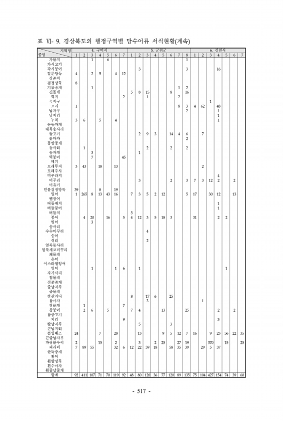 표 Ⅵ- 9. 경상북도의 행정구역별 담수어류 서식현황 계속 지역명 종명 4. 구미시 5. 군위군 6. 김천시 1 2 3 4 5 6 7 1 2 3 4 5 6 7 8 1 2 3 4 5 6 7 가물치 1 6 1 가시고기 각시붕어 3 3 16 갈문망둑 4 2 5 4 12 강준치 검정망둑 8 기름종개 1 1 2 긴몰개 5 8 15 8 16 꺽지 2 1 2 꾹저구 1 끄리 1 8 3 4 62 48 납자루 2 1 납지리 1 누치 3 6 5 4 1 눈동자개 대륙송사리 돌고기 2 9 3 14 4 6 7 돌마자 2 동방종개 동사리 1 2 2 2 동자개 3 1 떡붕어 7 45 메기 모래무지 3 43 18 13 2 모래주사 미꾸라지 4 미꾸리 3 2 3 7 3 12 2 2 미유기 민물검정망둑 39 8 19 밀어 1 265 8 1...
