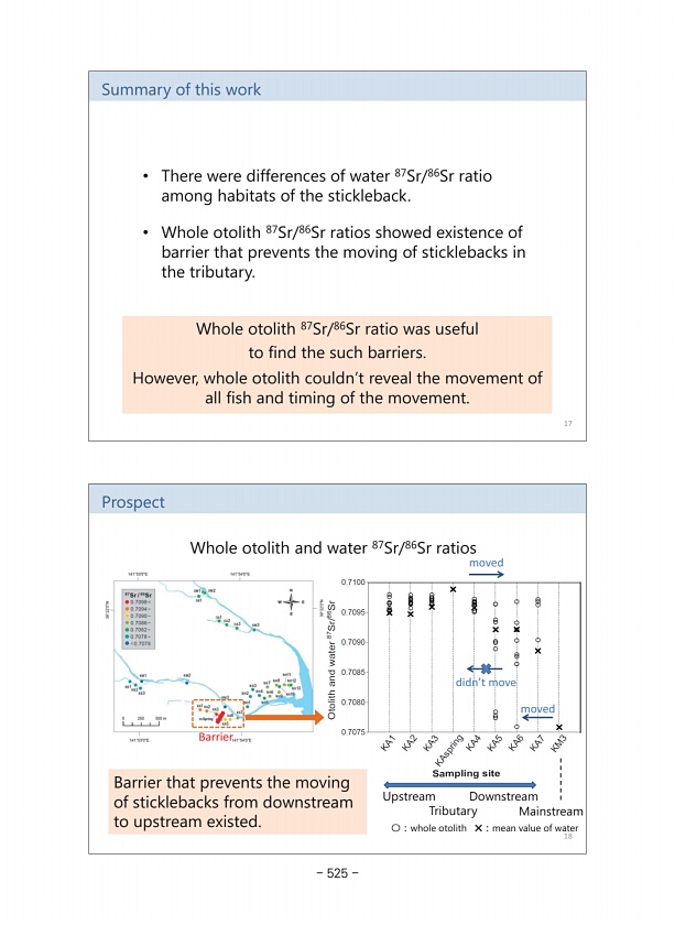 ?:whole otolith ?:mean value of water 18 Whole otolith and water 87Sr/86Sr ratios Upstream Downstream moved Tributary moved didn’t move Mainstream Barrier Prospect Barrier that prevents the moving of sticklebacks from downstream to upstream existed. 17 Summary of this work ? Whole otolith 87Sr/86Sr ratios showed existence of barrier that prevents the moving of sticklebacks in the tributary. ? Ther...