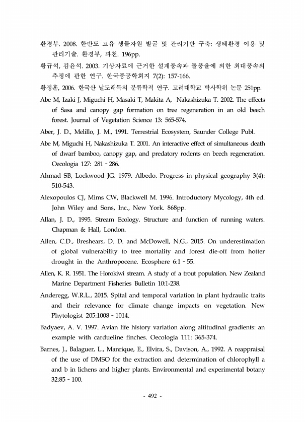 492 환경부. 2008. 한반도 고유 생물자원 발굴 및 관리기반 구축생태환경 이용 및 관리기술. 환경부, 과천. 196pp. 황규석, 김윤석. 2003. 기상자료에 근거한 설계풍속과 돌풍율에 의한 최대풍속의 추정에 관한 연구. 한국풍공학회지 7 2 157-166. 황정훈, 2006. 한국산 날도래목의 분류학적 연구. 고려대학교 박사학위 논문 251pp. Abe M, Izaki J, Miguchi H, Masaki T, Makita A, Nakashizuka T. 2002. The effects of Sasa and canopy gap formation on tree regeneration in an old beech forest. Journal of Vegetation Science 13565-574. A...