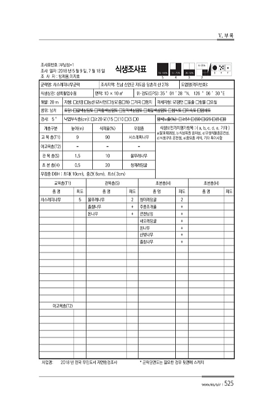 V. 부 록 www.nie.re.kr ?525 조사표번호 부남섬-1 조사 일자 2018 년 5 월 9 일, 7 월 18 일 조 사 자 방제용,이지효 식생조사표 군락명사스레피나무군락 조사지역전남 신안군 지도읍 당촌리 산 278 도엽명 격자번호 식생상관상록활엽수림 면적10 × 10 ㎡ 위·경도 GPS 35 ° 01 ′ 28 ″N, 126 ° 06 ′ 30 ″E 해발20 m 지형□산정 □능선 ?사면 ?상?중□하 □계곡 □평지 미세지형?평면 □돌출 □함몰 □요철 방위남서 토양□갈색삼림토 □적황색삼림토 □암적색삼림토 □회갈색삼림토 □침식토 □미숙토 □암쇄토 경사5 ° 낙엽부식층 cm □≥20 ? 15 □ 10 □ 5 □0 암석노출 % □≥51 □〈50 □〈25 □〈5 □0 계층구분 높이 m 식피율 % 우점종 식생보전...