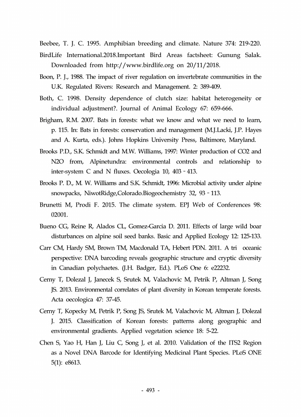 493 Beebee, T. J. C. 1995. Amphibian breeding and climate. Nature 374219-220. BirdLife International.2018.Important Bird Areas factsheetGunung Salak. Downloaded from http//www.birdlife.org on 20/11/2018. Boon, P. J., 1988. The impact of river regulation on invertebrate communities in the U.K. Regulated RiversResearch and Management. 2389-409. Both, C. 1998. Density dependence of clutch sizehabitat...