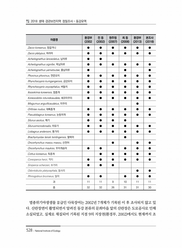 2018 생태·경관보전지역 정밀조사 동강유역 528 ? National Institute of Ecology 멸종위기야생생물 Ⅱ급인 다묵장어는 2002년 7개체가 기록된 이 후 조사되지 않고 있 다. 산란장면이 촬영되면서 알려진 동강 본류의 문희마을 앞의 산란장은 도로공사로 인해 소실되었고, 실제로 채집되어 기록된 지점 9의 지장천 환경부, 2002 에서도 현재까지 조 어종명 환경부 2002 전 등 2002 원주청 2007 최 등 2008 환경부 2013 본조사 2018 Zacco koreanus, 참갈겨니 ● ● ● ● ● ● Zacco platypus, 피라미 ● ● ● ● ● ● Acheilognathus lanceolatus, 납자루 ● ● Acheilognathus signifer, 묵납자루 ● ●...