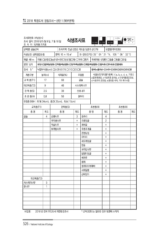 2018 특정도서 정밀조사 신안 1 북부권역 526 ? National Institute of Ecology 조사표번호 부남섬-2 조사 일자 2018 년 5 월 9 일, 7 월 18 일 조 사 자 방제용,이지효 식생조사표 군락명곰솔군락 조사지역전남 신안군 지도읍 당촌리 산 278 도엽명 격자번호 식생상관상록침엽수림 면적15 × 15 ㎡ 위·경도 GPS 35 ° 01 ′ 31 ″N, 126 ° 06 ′ 32 ″E 해발40 m 지형□산정 □능선 ?사면 ?상?중□하 □계곡 □평지 미세지형?평면 □돌출 □함몰 □요철 방위남서 토양□갈색삼림토 □적황색삼림토 □암적색삼림토 □회갈색삼림토 □침식토 □미숙토 □암쇄토 경사5 ° 낙엽부식층 cm □≥20 ? 15 □ 10 □ 5 □0 암석노출 % □≥51 □〈50 □〈25 ...