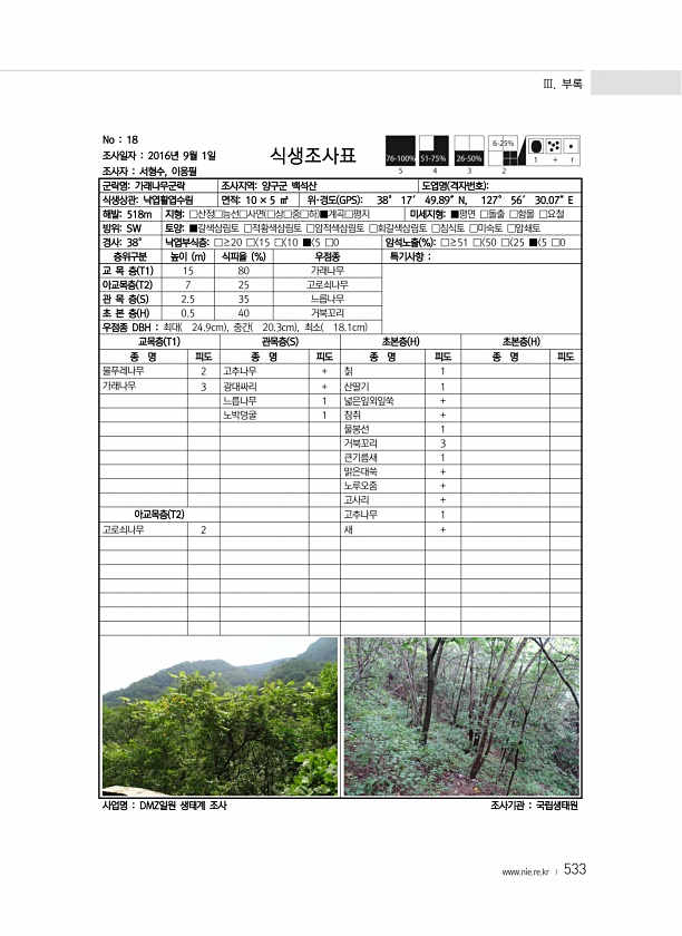 Ⅲ. 부록 www.nie.re.kr ? 533 No 18 조사일자 2016년 9월 1일 조사자 서형수, 이응필 식생조사표 군락명가래나무군락 조사지역양구군 백석산 도엽명 격자번호 식생상관낙엽활엽수림 면적10 × 5 ㎡ 위·경도 GPS 38° 17′ 49.89″N, 127° 56′ 30.07″E 해발518m 지형□산정□능선□사면 □상□중□하 ■계곡□평지 미세지형■평면 □돌출 □함몰 □요철 방위SW 토양■갈색삼림토 □적황색삼림토 □암적색삼림토 □회갈색삼림토 □침식토 □미숙토 □암쇄토 경사38° 낙엽부식층□≥20 □ 15 □ 10 ■ 5 □0 암석노출 % □≥51 □ 50 □ 25 ■ 5 □0 층위구분 높이 m 식피율 % 우점종 특기사항 교 목 층 T1 15 80 가래나무 아교목층 T2 7 25 고로쇠나무 관 목 ...
