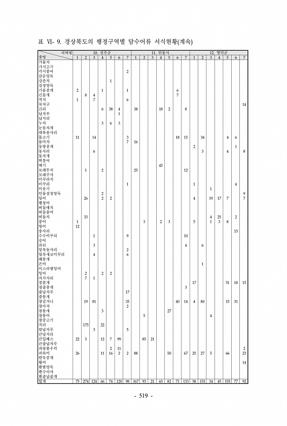 표 Ⅵ- 9. 경상북도의 행정구역별 담수어류 서식현황 계속 지역명 종명 10. 성주군 11. 안동시 12. 영덕군 1 2 3 4 5 6 7 1 2 3 4 5 6 7 1 2 3 4 5 6 7 가물치 가시고기 각시붕어 2 갈문망둑 강준치 1 검정망둑 기름종개 2 1 1 6 긴몰개 8 4 7 꺽지 1 7 6 꾹저구 14 끄리 6 38 4 38 18 2 8 납자루 1 납지리 누치 3 6 3 눈동자개 대륙송사리 돌고기 11 14 3 18 15 34 4 6 돌마자 7 16 동방종개 2 1 동사리 6 3 4 8 동자개 떡붕어 메기 45 모래무지 1 2 25 12 모래주사 미꾸라지 미꾸리 1 1 4 미유기 1 민물검정망둑 2 9 밀어 26 2 2 4 19 17 7 7 뱀장어 버들매치 버들붕어 버들치 33 4 25 2 붕어...