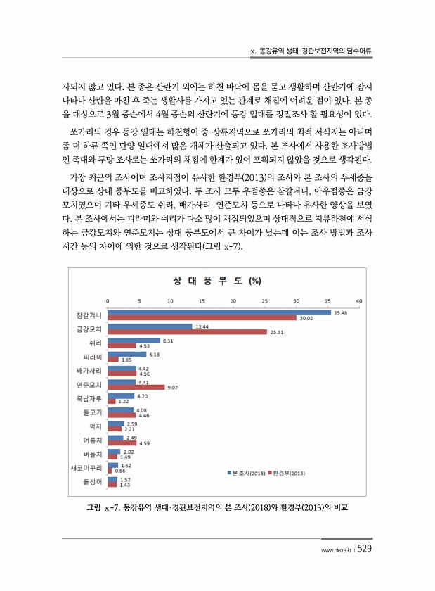 x. 동강유역 생태·경관보전지역의 담수어류 www.nie.re.kr ?529 사되지 않고 있다. 본 종은 산란기 외에는 하천 바닥에 몸을 묻고 생활하며 산란기에 잠시 나타나 산란을 마친 후 죽는 생활사를 가지고 있는 관계로 채집에 어려운 점이 있다. 본 종 을 대상으로 3월 중순에서 4월 중순의 산란기에 동강 일대를 정밀조사 할 필요성이 있다. 쏘가리의 경우 동강 일대는 하천형이 중·상류지역으로 쏘가리의 최적 서식지는 아니며 좀 더 하류 쪽인 단양 일대에서 많은 개체가 산출되고 있다. 본 조사에서 사용한 조사방법 인 족대와 투망 조사로는 쏘가리의 채집에 한계가 있어 포획되지 않았을 것으로 생각된다. 가장 최근의 조사이며 조사지점이 유사한 환경부 2013 의 조사와 본 조사의 우세종을 대상으로 상대 풍부도를 ...