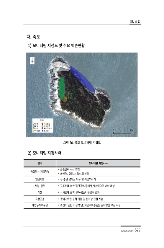 III. 종 합 www.nie.re.kr ?529 1 그림 76. 죽도 모니터링 지점도 2 분야 모니터링 지정사유 특정도서 지정사유 ? 곰솔군락 식생 양호 ? 화산역, 화산사, 화산회 분포 일반사항 ? 섬 주변 양식장 이용 및 어업쓰레기 지형·경관 ? 구조선에 의한 절단 해식동에서 시스택으로 변화 예상 식생 ? 서사면에 굴피나무-곰솔나무군락 변화 육상곤충 ? 깔때기트랩 설치 지점 및 변화상 관찰 지점 해안무척추동물 ? 조간대 암반 기질 발달, 해안무척추동물 종다양성 우점지점