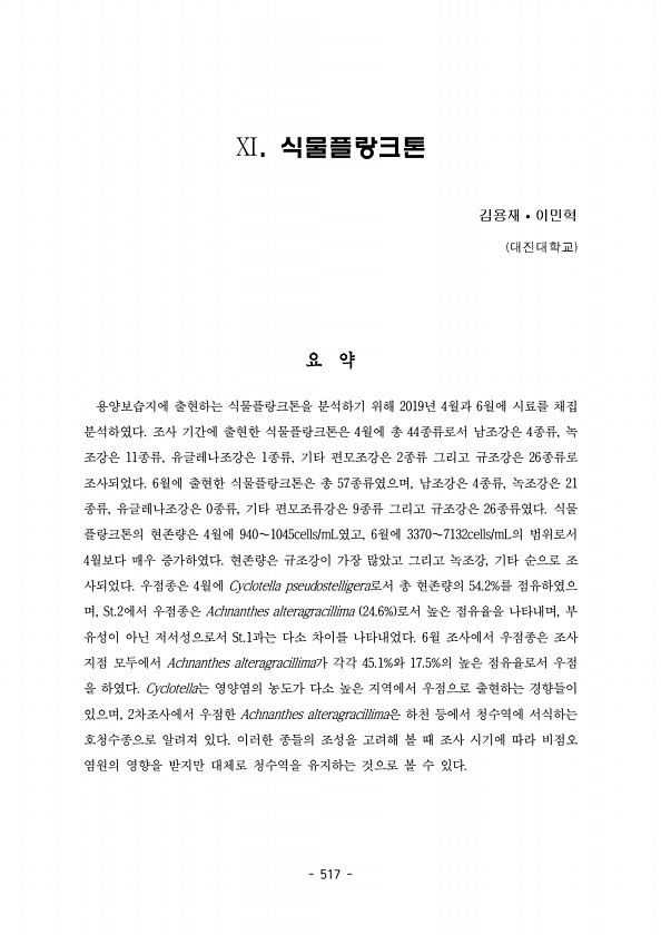 517 ?. 식물플랑크톤 ? 용양보습지에 출현하는 식물플랑크톤을 분석하기 위해 년 월과 월에 시료를 채집 2019 4 6 분석하였다 조사 기간에 출현한 식물플랑크톤은 월에 총 종류로서 남조강은 종류 녹 4 44 4 , 조강은 종류 유글레나조강은 종류 기타 편모조강은 종류 그리고 규조강은 종류로 11 , 1 , 2 26 조사되었다 월에 출현한 식물플랑크톤은 총 종류였으며 남조강은 종류 녹조강은 6 57 , 4 , 21 종류 유글레나조강은 종류 기타 편모조류강은 종류 그리고 규조강은 종류였다 식물 , 0 , 9 26 플랑크톤의 현존량은 월에 4 940 1045cells/mL , 6 3370 7132cells/mL ∼ 였고 월에 ∼ 의 범위로서 4월보다 매우 증가하였다 현존량은 규조강이 가장 많았고 그리고 녹조강...