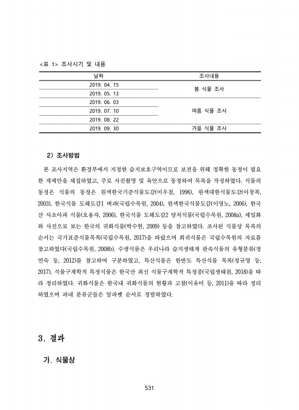 531 2 조사방법 본 조사지역은 환경부에서 지정한 습지보호구역이므로 보전을 위해 정확한 동정이 필요 한 개체만을 채집하였고, 주로 사진촬영 및 육안으로 동정하여 목록을 작성하였다. 식물의 동정은 식물의 동정은 원색한국기준식물도감 이우철, 1996 , 원색대한식물도감 이창복, 2003 , 한국식물 도해도감1 벼과 국립수목원, 2004 , 원색한국식물도감 이영노, 2006 , 한국 산 사초아과 식물 오용자, 2006 , 한국식물 도해도감2 양치식물 국립수목원, 2008a , 세밀화 와 사진으로 보는 한국의 귀화식물 박수현, 2009 등을 참고하였다. 조사된 식물상 목록의 순서는 국가표준식물목록 국립수목원, 2017 을 따랐으며 희귀식물은 국립수목원의 자료를 참고하였다 국립수목원, 2008b 수생식물은 우리나라...