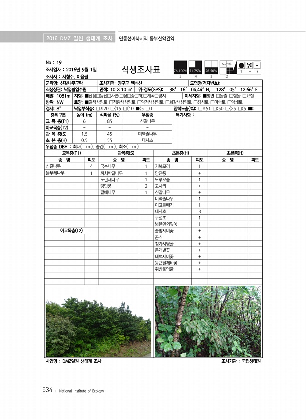 2016 DMZ 일원 생태계 조사 민통선이북지역 동부산악권역 534 ? National Institute of Ecology No 19 조사일자 2016년 9월 1일 조사자 서형수, 이응필 식생조사표 군락명신갈나무군락 조사지역양구군 백석산 도엽명 격자번호 식생상관낙엽활엽수림 면적10 × 10 ㎡ 위·경도 GPS 38° 16′ 04.44″N, 128° 05′ 12.66″E 해발1081m 지형■산정□능선□사면 □상□중□하 □계곡□평지 미세지형■평면 □돌출 □함몰 □요철 방위NW 토양■갈색삼림토 □적황색삼림토 □암적색삼림토 □회갈색삼림토 □침식토 □미숙토 □암쇄토 경사8° 낙엽부식층□≥20 □ 15 □ 10 ■ 5 □0 암석노출 % □≥51 □ 50 □ 25 □ 5 ■0 층위구분 높이 m 식피율 % 우점종 특기사...