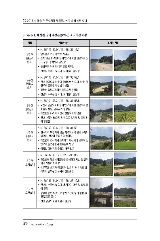 2018 생태·경관 우수지역 발굴조사 경북 내성천 일대 534 ? National Institute of Ecology 지점 지점현황 조사지 사진 1구간 탄산리 습지 N. 36° 43′52.9″ E. 128° 37′16.7″ 영주댐과 인접해 있는 지역임 습지 인근에 무섬마을이 있으며 마을 뒷편으로 낮 은 구릉, 경작지가 발달함 관광객의 이동이 매우 많은 지역임 천변의 수폭은 넓으며, 모래톱이 발달함 2구간 석탑교 습지 N. 36° 42′51.5″ E. 128° 35′59.1″ 천변 양안으로 마을이 형성되어 있으며, 마을 뒤 편으로 혼효림의 산림이 있음 하천변 일부지역에서 경작지가 형성됨 천변의 수폭은 넓으며, 모래톱이 발달함 3구간 오신교 습지 N. 36° 41′03.2″ E. 128° 31′56.5″ 오신...