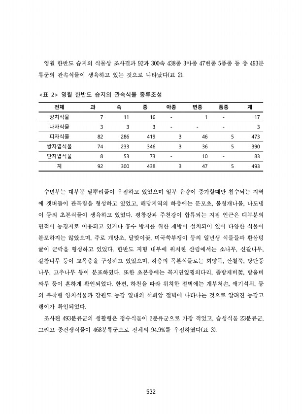 532 영월 한반도 습지의 식물상 조사결과 92과 300속 438종 3아종 47변종 5품종 등 총 493분 류군의 관속식물이 생육하고 있는 것으로 나타났다 표 2 전체 과 속 종 아종 변종 품종 계 양치식물 7 11 16 1 17 나자식물 3 3 3 3 피자식물 82 286 419 3 46 5 473 쌍자엽식물 74 233 346 3 36 5 390 단자엽식물 8 53 73 10 83 계 92 300 438 3 47 5 493 표 2 영월 한반도 습지의 관속식물 종류조성 수변부는 대부분 달뿌리풀이 우점하고 있었으며 일부 유량이 증가할때만 침수되는 지역 에 갯버들이 관목림을 형성하고 있었고, 해당지역의 하층에는 문모초, 물칭개나물, 나도냉 이 등의 초본식물이 생육하고 있었다. 평창강과 주천강이 합류되는 지점 ...