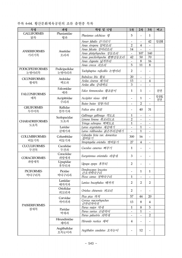 543 기러기목 오리과 논병아리목 논병아리과 황새목 백로과 매목 매과 수리과 두루미목 뜸부기과 도요목 도요과 갈매기과 비둘기목 비둘기과 두견목 두견과 파랑새목 파랑새과 후투티과 딱다구리목 딱다구리과 참새목 때까치과 꾀꼬리과 까마귀과 박새과 제비과오목눈이과