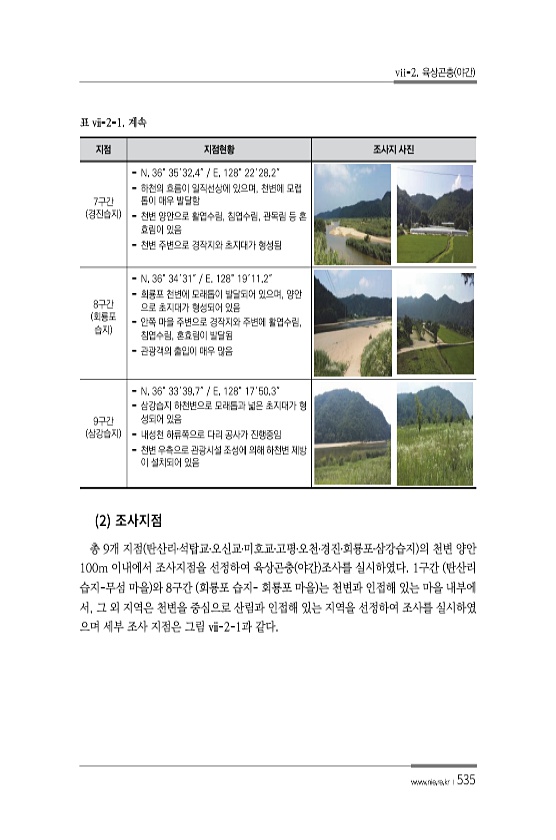 vii-2. 육상곤충 야간 www.nie.re.kr ?535 2 총 9개 지점 탄산리?석탑교?오신교?미호교?고평?오천?경진?회룡포?삼강습지 의 천변 양안 100m 이내에서 조사지점을 선정하여 육상곤충 야간 조사를 실시하였다. 1구간 탄산리 습지-무섬 마을 와 8구간 회룡포 습지- 회룡포 마을 는 천변과 인접해 있는 마을 내부에 서, 그 외 지역은 천변을 중심으로 산림과 인접해 있는 지역을 선정하여 조사를 실시하였 으며 세부 조사 지점은 그림 ⅶ-2-1과 같다. 지점 지점현황 조사지 사진 7구간 경진습지 N. 36° 35′32.4″ E. 128° 22′28.2″ 하천의 흐름이 일직선상에 있으며, 천변에 모랩 톱이 매우 발달함 천변 양안으로 활엽수림, 침엽수림, 관목림 등 혼 효림이 있음 천변 주변으로 경작지와...