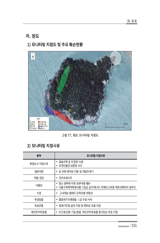 III. 종 합 www.nie.re.kr ?531 1 그림 77. 원도 모니터링 지점도 2 분야 모니터링 지정사유 특정도서 지정사유 ? 곰솔군락 등 안정된 식생 ? 희귀식물인 보춘화 서식 일반사항 ? 섬 주변 양식장 이용 및 어업쓰레기 지형·경관 ? 간조육계사주 식물상 ? 염소 방목에 따른 초본식생 훼손 ? 식물구계학적특정식물 Ⅱ등급 실거리나무, 한반도고유종 백운산원추리 생육지 식생 ? 고사리밭 벌채지 관목식생 변화상 육상동물 ? 멸종위기야생생물 Ⅰ급 수달 서식 육상곤충 ? 깔때기트랩 설치 지점 및 변화상 관찰 지점 해안무척추동물 ? 조간대 암반 기질 발달, 해안무척추동물 종다양성 우점지점