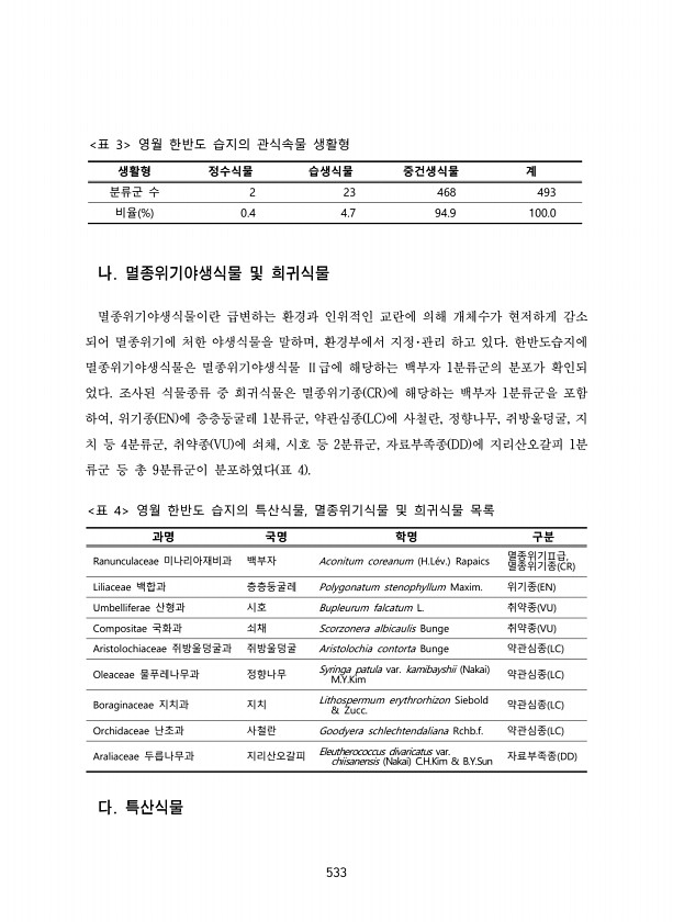 533 생활형 정수식물 습생식물 중건생식물 계 분류군 수 2 23 468 493 비율 % 0.4 4.7 94.9 100.0 표 3 영월 한반도 습지의 관식속물 생활형 나. 멸종위기야생식물 및 희귀식물 멸종위기야생식물이란 급변하는 환경과 인위적인 교란에 의해 개체수가 현저하게 감소 되어 멸종위기에 처한 야생식물을 말하며, 환경부에서 지정?관리 하고 있다. 한반도습지에 멸종위기야생식물은 멸종위기야생식물 Ⅱ급에 해당하는 백부자 1분류군의 분포가 확인되 었다. 조사된 식물종류 중 희귀식물은 멸종위기종 CR 에 해당하는 백부자 1분류군을 포함 하여, 위기종 EN 에 층층둥굴레 1분류군, 약관심종 LC 에 사철란, 정향나무, 쥐방울덩굴, 지 치 등 4분류군, 취약종 VU 에 쇠채, 시호 등 2분류군, 자료부족종 DD ...