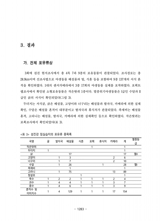 1283 3. 결과 가. 전체 포유류상 3회에 걸친 현지조사에서 총 4목 7과 9종의 포유동물이 관찰되었다. 조사경로는 총 28.9km이며 선조사법으로 야생동물 배설물과 털, 식흔 등을 포함하여 9종 137개의 서식 흔 적을 확인하였다. 1대의 센서카메라에서 3종 17회의 야생동물 실체를 포착하였다. 포획트 랩조사에서 확인된 소형포유동물은 작은땃쥐 1종이다. 멸종위기야생동물은 I급인 수달과 II 급인 삵의 서식이 확인되었다 그림 3 두더지는 서식굴, 삵은 배설물, 고양이와 너구리는 배설물과 발자국, 카메라에 의한 실체 확인, 수달은 배설물 흔적이 대부분이고 발자국과 휴식처가 관찰되었다. 족제비는 배설물 흔적, 고라니는 배설물, 발자국, 카메라에 의한 실체확인 등으로 확인하였다. 작은땃쥐는 포획조사에서 확인되...