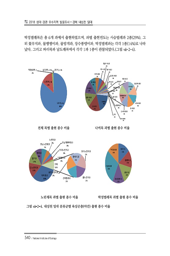 2018 생태·경관 우수지역 발굴조사 경북 내성천 일대 540 ? National Institute of Ecology 딱정벌레목은 총 6개 과에서 출현하였으며, 과별 출현빈도는 사슴벌레과 2종 29% , 그 외 꽃무지과, 물땡땡이과, 물방개과, 장수풍뎅이과, 딱정벌레과는 각각 1종 14% 로 나타 났다. 그리고 파리목과 날도래목에서 각각 1과 1종이 관찰되었다. 그림 ⅶ-2-4 나비목, 342, 84% 노린재목, 58, 14% 딱정벌레목, 7, 2% 날도래목, 1, 0% 파리목, 1, 0% Erebidae 19% 밤나방과 17% 풀명나방과 14% 자나방과 13% 명나방과 8% 재주나방과 5% 박각시과 5% 잎말이나방과 4% 쐐기나방과 3% 갈고리나방과 3% 혹나방과 1% 불나방과 1% 뿔나방과 1% 솔나방...
