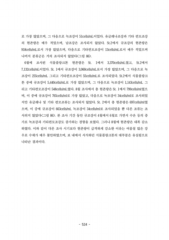 524 로 가장 많았으며 그 다음으로 녹조강이 이었다 유글레나조강과 기타 편모조강 , 51cells/mL 의 현존량은 매우 적었으며 남조강은 조사되지 않았다 에서 규조강의 현존량은 , St.2 918cells/mL로서 가장 많았으며 다음으로 기타편모조강이 로서 매우 적었으며 , 13cells/mL 나머지 분류군은 거의 조사되지 않았다 그림 86 6월에 조사된 식물플랑크톤 현존량은 에서 St. 1 3,370cells/mL , St.2 였고 에서 7,132cells/mL St. 1 이었다 에서 규조강이 3,060cells/mL로서 가장 많았으며 그 다음으로 녹 , 조강이 255cells/mL 그리고 기타편모조강이 로 조사되었다 에서 식물플랑크 55cells/mL St.2 톤 중에 규조강이 5,440cells/m...