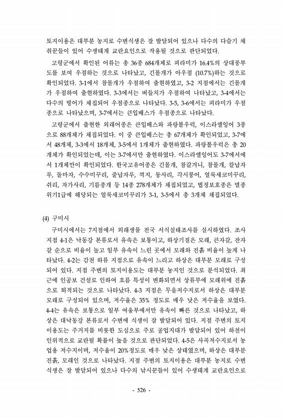 토지이용은 대부분 농지로 수변식생은 잘 발달되어 있으나 다수의 다슬기 채 취꾼들이 있어 수생태계 교란요인으로 작용될 것으로 판단되었다. 고령군에서 확인된 어류는 총 36종 684개체로 피라미가 16.4%의 상대풍부 도를 보여 우점하는 것으로 나타났고, 긴몰개가 아우점 10.7% 하는 것으로 확인되었다. 3-1에서 참몰개가 우점하여 출현하였고, 3-2 지점에서는 긴몰개 가 우점하여 출현하였다. 3-3에서는 버들치가 우점하여 나타났고, 3-4에서는 다수의 빙어가 채집되어 우점종으로 나타났다. 3-5, 3-6에서는 피라미가 우점 종으로 나타났으며, 3-7에서는 큰입배스가 우점종으로 나타났다. 고령군에서 출현한 외래어종은 큰입배스와 파랑볼우럭, 이스라엘잉어 3종 으로 88개체가 채집되었다. 이 중 큰입배스는 총 6...