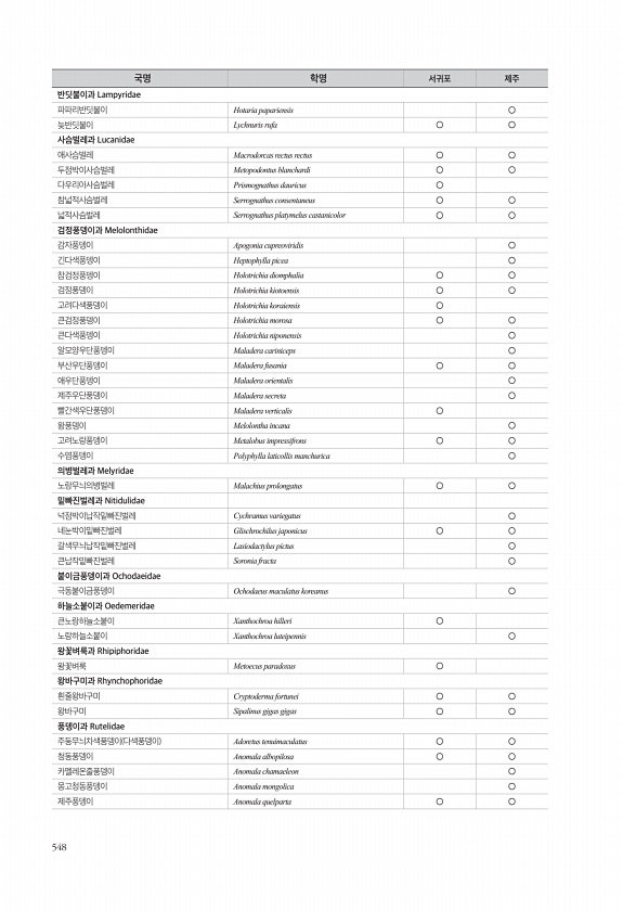 548 반딧불이과 Lampyridae 파파리반딧불이 Hotaria papariensis ○ 늦반딧불이 Lychnuris rufa ○ ○ 사슴벌레과 Lucanidae 애사슴벌레 Macrodorcas rectus rectus ○ ○ 두점박이사슴벌레 Metopodontus blanchardi ○ ○ 다우리아사슴벌레 Prismognathus dauricus ○ 참넓적사슴벌레 Serrognathus consentaneus ○ ○ 넓적사슴벌레 Serrognathus platymelus castanicolor ○ ○ 검정풍뎅이과 Melolonthidae 감자풍뎅이 Apogonia cupreoviridis ○ 긴다색풍뎅이 Heptophylla picea ○ 참검정풍뎅이 Holotrichia diomphalia ○ ○ 검정...