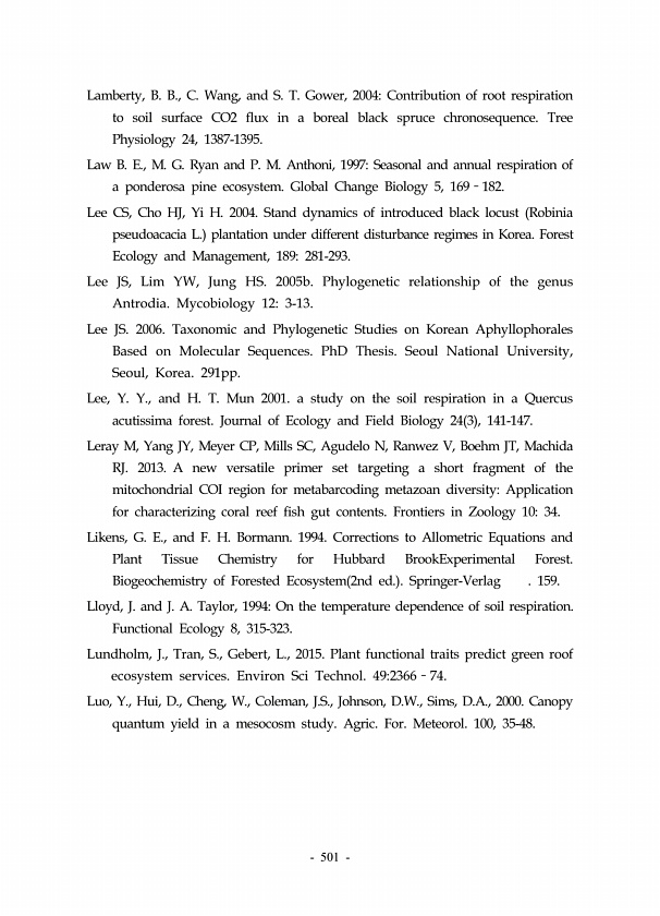 501 Lamberty, B. B., C. Wang, and S. T. Gower, 2004Contribution of root respiration to soil surface CO2 flux in a boreal black spruce chronosequence. Tree Physiology 24, 1387-1395. Law B. E., M. G. Ryan and P. M. Anthoni, 1997Seasonal and annual respiration of a ponderosa pine ecosystem. Global Change Biology 5, 169?182. Lee CS, Cho HJ, Yi H. 2004. Stand dynamics of introduced black locust Robinia...