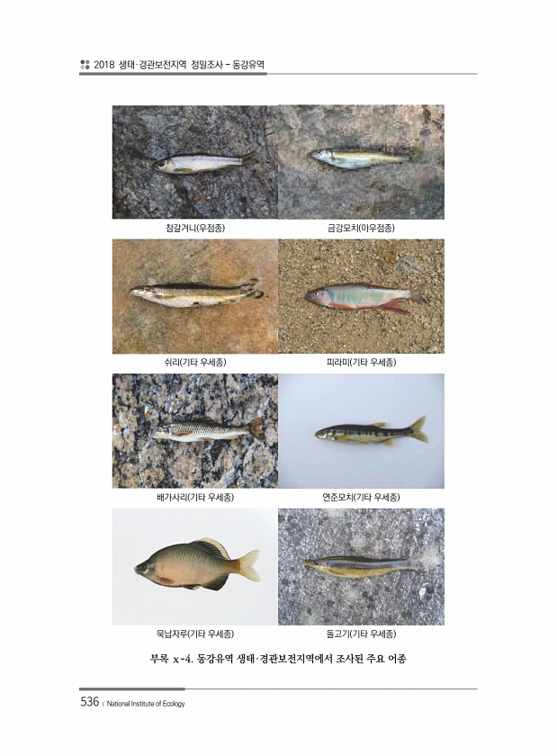 2018 생태·경관보전지역 정밀조사 동강유역 536 ? National Institute of Ecology 참갈겨니 우점종 금강모치 아우점종 쉬리 기타 우세종 피라미 기타 우세종 배가사리 기타 우세종 연준모치 기타 우세종 묵납자루 기타 우세종 돌고기 기타 우세종 부록 ⅹ-4. 동강유역 생태·경관보전지역에서 조사된 주요어종