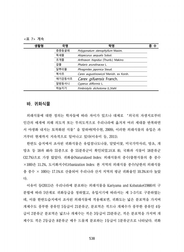 538 생활형 국명 학명 종 수 층층둥굴레 Polygonatum stenophyllum Maxim. 뚝새풀 Alopecurus aequalis Sobol. 조개풀 Arthraxon hispidus Thunb. Makino 갈풀 Phalaris arundinacea L. 달뿌리풀 Phragmites japonica Steud. 북사초 Carex augustinowiczii Menish. ex Korsh. 애기감둥사초 Carex gifuensis Franch. 알방동사니 Cyperus difformis L. 하늘지기 Fimbristylis dichotoma L. Vahl 표 7 계속 바. 귀화식물 외래식물에 대한 정의는 학자들에 따라 차이가 있으나 대체로 ‘외국의 자생지로부터 인간의 매개에 의해 의도적 또는 무...