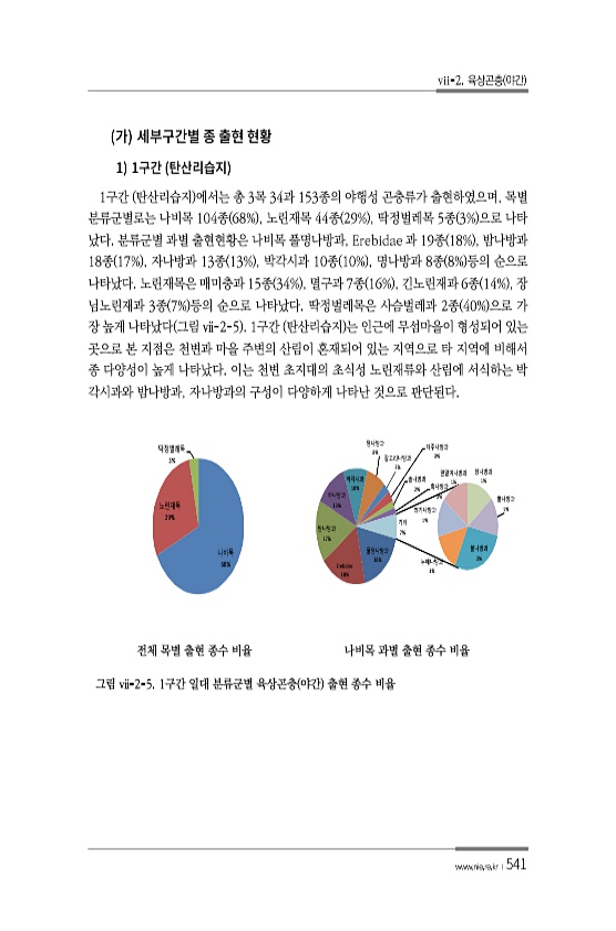 vii-2. 육상곤충 야간 www.nie.re.kr ?541 1 1구간 탄산리습지 에서는 총 3목 34과 153종의 야행성 곤충류가 출현하였으며, 목별 분류군별로는 나비목 104종 68% , 노린재목 44종 29% , 딱정벌레목 5종 3% 으로 나타 났다. 분류군별 과별 출현현황은 나비목 풀명나방과, Erebidae 과 19종 18% , 밤나방과 18종 17% , 자나방과 13종 13% , 박각시과 10종 10% , 명나방과 8종 8% 등의 순으로 나타났다. 노린재목은 매미충과 15종 34% , 멸구과 7종 16% , 긴노린재과 6종 14% , 장 님노린재과 3종 7% 등의 순으로 나타났다. 딱정벌레목은 사슴벌레과 2종 40% 으로 가 장 높게 나타났다 그림 ⅶ-2-5 1구간 탄산리습지 는 인근에 무섬마을이...