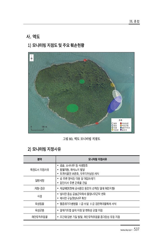 III. 종 합 www.nie.re.kr ?537 1 그림 80. 역도 모니터링 지점도 2 분야 모니터링 지정사유 특정도서 지정사유 ? 곰솔, 소사나무 등 식생양호 ? 풍혈지형, 해식노치 발달 ? 희귀식물인 보춘화, 두루미처남성 서식 일반사항 ? 섬 주변 양식장 이용 및 어업쓰레기 ? 접안시서 주변 건축물 건설 지형·경관 ? 자갈해안 현재 공사중인 동안의 선착장 일대 해안지형 식생 ? 남사면 중심 곰솔군락에서 졸참나무군락 변화 ? 북사면 구실잣밤나무 확산 육상동물 ? 멸종위기야생생물 Ⅰ급 수달, Ⅱ급 검은머리물떼새 서식 육상곤충 ? 깔때기트랩 설치 지점 및 변화상 관찰 지점 해안무척추동물 ? 조간대 암반 기질 발달, 해안무척추동물 종다양성 우점지점
