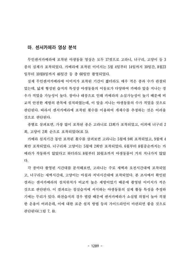 1289 마. 센서카메라 영상 분석 무인센서카메라에 포착된 야생동물 영상은 모두 17컷으로 고라니, 너구리, 고양이 등 3 종의 실체가 포착되었다. 카메라에 포착된 이미지는 5월 4일부터 14일까지 10일간, 8월23 일부터 10월8일까지 46일간 등 총 60일만 촬영되었다. 실제 무인센서카메라에 이미지가 포착된 기간이 짧더라도 매우 적은 종과 수가 관찰되 었는데, 넓게 형성된 습지의 특성상 야생동물의 이동로가 다양하여 카메라 앞을 지나는 경 우가 적었을 가능성이 높다. 장마나 태풍으로 인해 카메라의 소실가능성이 높기 때문에 비 교적 안전한 제방의 관목에 설치하였는데, 이 앞을 지나는 야생동물의 수가 적었을 것으로 판단된다. 따라서 센서카메라에 포착된 횟수를 이용하여 개체수를 추정하는 것은 어려울 것으로 판...