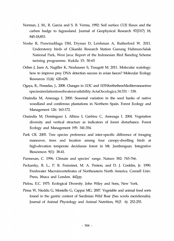 504 Norman, J. M., R. Garcia and S. B. Verma, 1992Soil surface CO2 fluxes and the carbon budge to fagrassland. Journal of Geophysical Research 97 D17 18, 845-18,853. Noske R, Prawiradilaga DM, Drynan D, Leishman A, Rutherford W. 2011. Understorey birds of Cikaniki Research Station Gunung Halimun-Salak National Park, West JavaReport of the Indonesian Bird Banding Scheme tarining programme. Kukila 1...