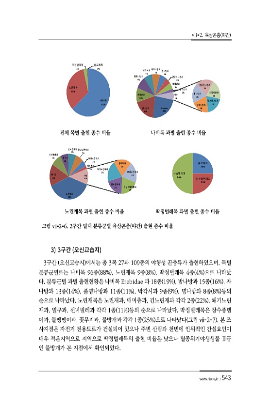 vii-2. 육상곤충 야간 www.nie.re.kr ?543 나비목 63% 노린재목 33% 딱정벌레목 3% 날도래목 1% Erebidae 24% 밤나방과 19% 자나방과 11% 풀명나방과 9% 박각시과 7% 재주나방과 7% 명나방과 6% 잎말이나방과 5% 혹나방과 5% 뿔나방과 2% 갈고리나방과 1% 누에나방과 1% 솔나방과 1% 왕물결나방과 1% 파좀나방과 기타 1% 5% 전체 목별 출현 종수 비율 나비목 과별 출현 종수 비율 노린재과 38% 매미과 16% 선녀벌레과 9% 멸구과 7% 긴노린재과 7% 장님노린재과 7% 허리노린재과 4% 매미충과 2% 큰날개매미충과 2% 뿔노린재과 2% 쐐기노린재과 2% 좀매미과 2% 호리노린재과 기타 2% 10% 꽃무지과 25% 장수풍뎅이과 25% 사슴벌레과 50% 노린재...