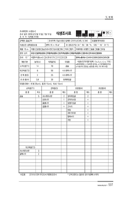 V. 부 록 www.nie.re.kr ?537 조사표번호 소정섬-2 조사 일자 2018 년 5 월 10 일, 7 월 19 일 조 사 자 방제용,이지효 식생조사표 군락명곰솔군락 조사지역전남 신안군 압해면 고이리 산 345, 산 346 도엽명 격자번호 식생상관상록침엽수림 면적15 × 15 ㎡ 위·경도 GPS 34 ° 55 ′ 38 ″N, 126 ° 16 ′ 31 ″E 해발15 m 지형□산정 □능선 ?사면 ?상?중□하 □계곡 □평지 미세지형?평면 □돌출 □함몰 □요철 방위남서 토양□갈색삼림토 □적황색삼림토 □암적색삼림토 □회갈색삼림토 □침식토 □미숙토 □암쇄토 경사10 ° 낙엽부식층 cm □≥20 ? 15 □ 10 □ 5 □0 암석노출 % □≥51 □〈50 □〈25 □〈5 □0 계층구분 높이 m 식피율 % 우점종...