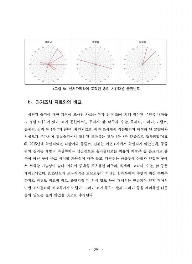 1291 그림 8 센서카메라에 포착된 종의 시간대별 출현빈도 바. 과거조사 자료와의 비교 섬진강 습지에 대한 과거에 조사된 자료는 함과 전 2015 에 의해 작성된 ‘전국 내륙습 지 정밀조사’가 있다. 과거 문헌에서는 두더지, 삵, 너구리, 수달, 족제비, 고라니, 다람쥐, 등줄쥐, 집쥐 등 4목 7과 9종이 확인되었고, 이번 조사에서 작은땃쥐와 야생화 된 고양이와 청설모가 추가되어 침실습지에서 확인된 포유류는 모두 4목 8과 12종으로 조사되었다 표 6 2015년에 확인되었던 다람쥐와 등줄쥐, 집쥐는 이번조사에서 확인되지 않았는데, 등줄 쥐와 집쥐는 제방의 바깥쪽이나 섬진강으로 흘러들어오는 지류의 제방부 등 콘크리트 블 록이 아닌 곳에 주로 서식할 가능성이 매우 높고, 다람쥐는 하류부에 산림과 인접한 곳에...