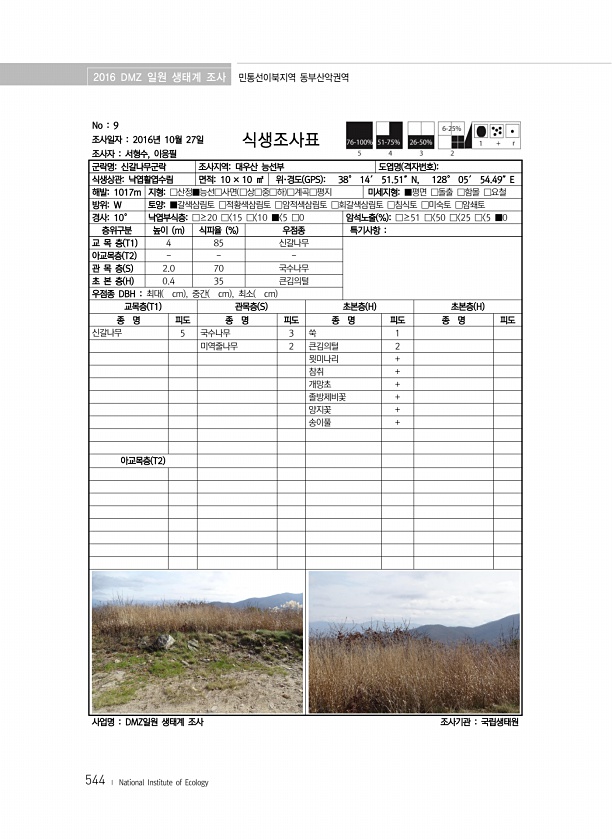 2016 DMZ 일원 생태계 조사 민통선이북지역 동부산악권역 544 ? National Institute of Ecology No 9 조사일자 2016년 10월 27일 조사자 서형수, 이응필 식생조사표 군락명신갈나무군락 조사지역대우산 능선부 도엽명 격자번호 식생상관낙엽활엽수림 면적10 × 10 ㎡ 위·경도 GPS 38° 14′ 51.51″N, 128° 05′ 54.49″E 해발1017m 지형□산정■능선□사면 □상□중□하 □계곡□평지 미세지형■평면 □돌출 □함몰 □요철 방위W 토양■갈색삼림토 □적황색삼림토 □암적색삼림토 □회갈색삼림토 □침식토 □미숙토 □암쇄토 경사10° 낙엽부식층□≥20 □ 15 □ 10 ■ 5 □0 암석노출 % □≥51 □ 50 □ 25 □ 5 ■0 층위구분 높이 m 식피율 % 우점종 특기...