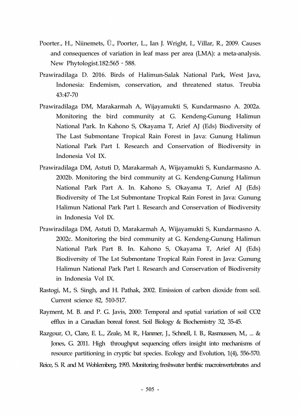 505 Poorter., H., Niinemets, ?., Poorter, L., Ian J. Wright, I., Villar, R., 2009. Causes and consequences of variation in leaf mass per area LMA a meta-analysis. New Phytologist.182565?588. Prawiradilaga D. 2016. Birds of Halimun-Salak National Park, West Java, IndonesiaEndemism, conservation, and threatened status. Treubia 4347-70 Prawiradilaga DM, Marakarmah A, Wijayamukti S, Kundarmasno A. 200...
