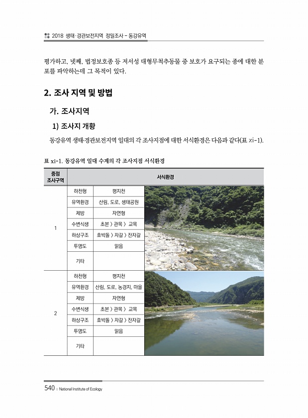 2018 생태·경관보전지역 정밀조사 동강유역 540 ? National Institute of Ecology 평가하고, 넷째, 법정보호종 등 저서성 대형무척추동물 중 보호가 요구되는 종에 대한 분 포를 파악하는데 그 목적이 있다. 2. 1 동강유역 생태?경관보전지역 일대의 각 조사지점에 대한 서식환경은 다음과 같다 표 ?-1 중점 조사구역 서식환경 1 하천형 평지천 유역환경 산림, 도로, 생태공원 제방 자연형 수변식생 초본 관목 교목 하상구조 호박돌 자갈 잔자갈 투명도 맑음 기타 2 하천형 평지천 유역환경 산림, 도로, 농경지, 마을 제방 자연형 수변식생 초본 관목 교목 하상구조 호박돌 자갈 잔자갈 투명도 맑음 기타 표 xi-1. 동강유역 일대 수계의 각 조사지점서식환경