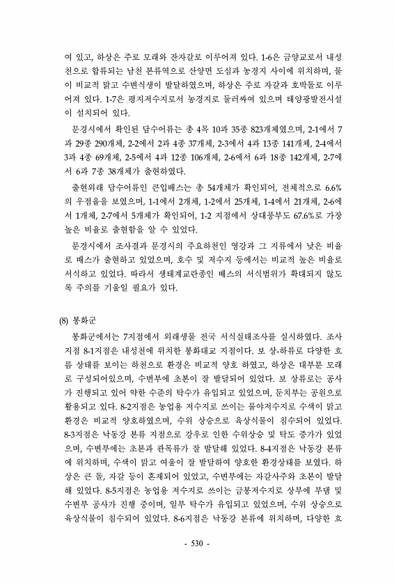 여 있고, 하상은 주로 모래와 잔자갈로 이루어져 있다. 1-6은 금양교로서 내성 천으로 합류되는 남천 본류역으로 산양면 도심과 농경지 사이에 위치하며, 물 이 비교적 맑고 수변식생이 발달하였으며, 하상은 주로 자갈과 호박돌로 이루 어져 있다. 1-7은 평지저수지로서 농경지로 둘러싸여 있으며 태양광발전시설 이 설치되어 있다. 문경시에서 확인된 담수어류는 총 4목 10과 35종 823개체였으며, 2-1에서 7 과 29종 290개체, 2-2에서 2과 4종 37개체, 2-3에서 4과 13종 141개체, 2-4에서 3과 4종 69개체, 2-5에서 4과 12종 106개체, 2-6에서 6과 18종 142개체, 2-7에 서 6과 7종 38개체가 출현하였다. 출현외래 담수어류인 큰입배스는 총 54개체가 확인되어, 전체적으로...