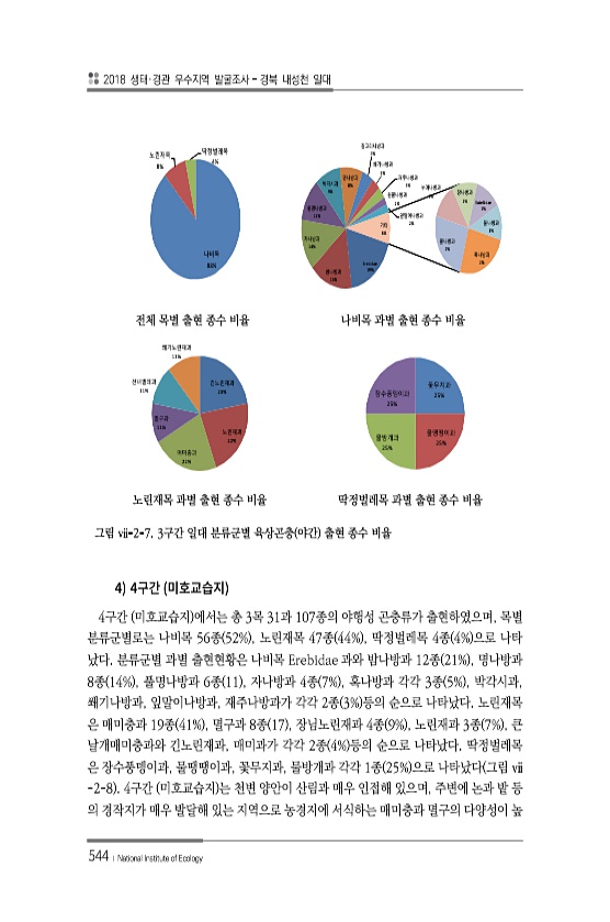 2018 생태·경관 우수지역 발굴조사 경북 내성천 일대 544 ? National Institute of Ecology 나비목 88% 노린재목 8% 딱정벌레목 4% Erebidae 밤나방과 19% 16% 자나방과 14% 풀명나방과 11% 박각시과 9% 명나방과 8% 갈고리나방과 4% 쐐기나방과 3% 재주나방과 3% 원뿔나방과 2% 잎말이나방과 2% 혹나방과 2% 뿔나방과 2% 누에나방과 1% 창나방과 1% Euteliidae 1% 불나방과 1% 기타 8% 전체 목별 출현 종수 비율 나비목 과별 출현 종수 비율 긴노린재과 23% 노린재과 22% 매미충과 22% 멸구과 11% 선녀벌레과 11% 쐐기노린재과 11% 꽃무지과 25% 물땡땡이과 25% 물방개과 25% 장수풍뎅이과 25% 노린재목 과별 출현 종수 비율...