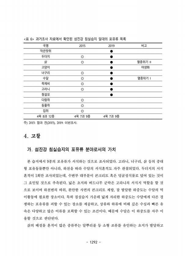 1292 표 6 과거조사 자료에서 확인된 섬진강 침실습지 일대의 포유류 목록 국명 2015 2019 비고 작은땃쥐 ● 두더지 ◎ ● 삵 ◎ ● 멸종위기 II 고양이 ● 야생화 너구리 ◎ ● 수달 ◎ ● 멸종위기 I 족제비 ◎ ● 고라니 ◎ ● 청설모 ● 다람쥐 ◎ 등줄쥐 ◎ 집쥐 ◎ 4목 8과 12종 4목 7과 9종 4목 7과 9종 주 2015함과 전 2015 , 2019이번조사. 4. 고찰 가. 섬진강 침실습지의 포유류 분야로서의 가치 본 습지에서 9종의 포유류가 서식하는 것으로 조사되었다. 고라니, 너구리, 삵 등의 중대 형 포유동물뿐만 아니라, 하천을 따라 수달의 서식흔적도 자주 관찰되었다. 두더지의 서식 흔적이 1회만 조사되었는데, 수변부 대부분이 콘크리트 혹은 덩굴성식물로 덮여 있는 것이 그 요인일...