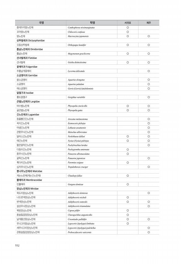 552 흰테두리땅노린재 Canthophorus niveimarginatus ○ 꼬마땅노린재 Chilocoris confusus ○ 땅노린재 Macroscytus japonensis ○ ○ 상투벌레과 Dictyopharidae 깃동상투벌레 Orthopagus lunulifer ○ ○ 톱날노린재과 Dinidoridae 톱날노린재 Megymenum gracilicorne ○ ○ 선녀벌레과 Flatidae 선녀벌레 Geisha distinctissima ○ ○ 꽃매미과 Fulgoridae 주홍날개꽃매미 Lycorma delicatula ○ 소금쟁이과 Gerridae 왕소금쟁이 Aquarius elongatus ○ 소금쟁이 Aquarius paludum ○ 애소금쟁이 Gerris Gerris latiabdominis...